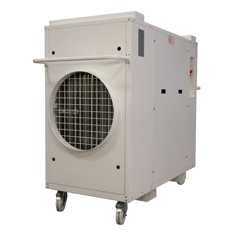 De compacte unit kan ook buiten worden geïnstalleerd met zeer flexibele luchtkanalen om de warme lucht naar binnen te leiden. Een efficiënt snelkoppelsysteem garandeert een snelle installatie met ons hele aanbod aan FCU’s, chillers en ketelhuizen. De geïntegreerde wielen faciliteren een eenvoudige verplaatsing van de unit.